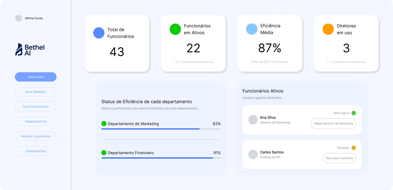 Recrute talentos, crie planos de treinamento, desenvolva cultura organizacional, estruture organogramas e implemente avaliações de performance.